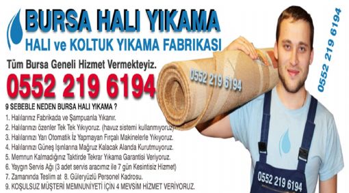 halı temizleme, bursa halı yıkama fırsatları kampanyaları, Bursa Antibakteriyel halı yıkama veya Bursa Halı Yıkama ve Koltuk Yıkama Hizmetleri ve Stor Perde Yıkama İle İlgili Bilgiler. 20 yıldır hizmete devam. Bursa''da kalitenin adresi. Bursa Halı Yıkama yerleri fabrikası, Bursa halı yıkama hizmetleri siz değerli müşterilerimize kaliteden ödün vermeden uygun fiyatları ile hizmet vermeyi hedeflemiştir.